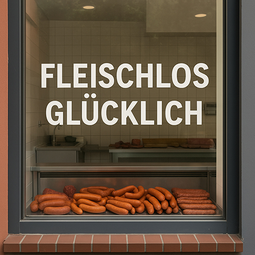 "Fleischlos glücklich" stand auf dem Schaufenster – direkt über einem Haufen Würstchen. Vielleicht ein kleiner Marketing-Fauxpas?
