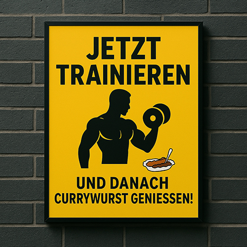 Direkt neben dem Eingang ein Plakat: "Jetzt trainieren und danach Currywurst genießen!" – na dann, Prost Mahlzeit!