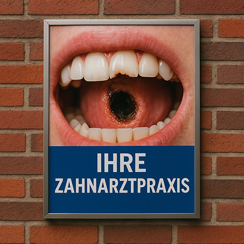 Ein Werbeplakat mit einem riesigen, schwarzen Loch im Zahn – appetitlicher wird’s nicht. Lieber direkt weggeschaut.